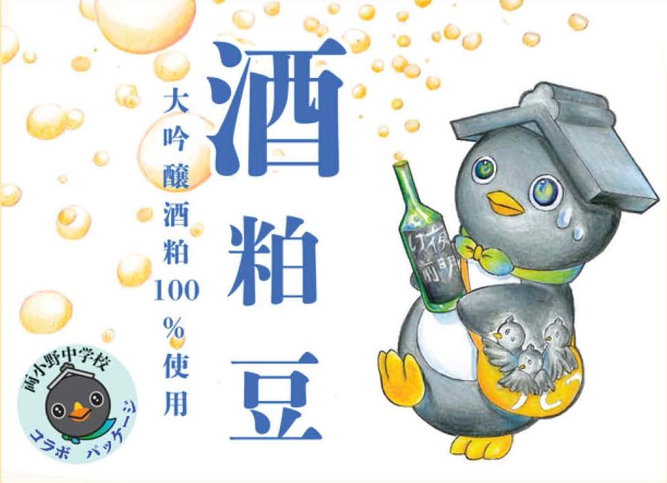 両小野中学校3年生がデザインしたオリジナルラベルで、小野酒造店の酒粕を使った酒粕豆を販売します。3月 …