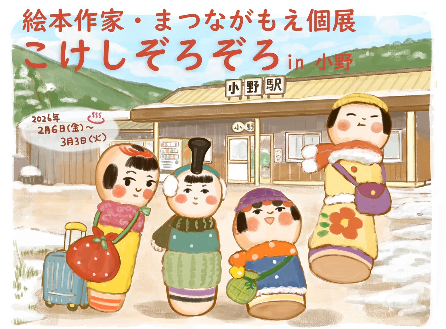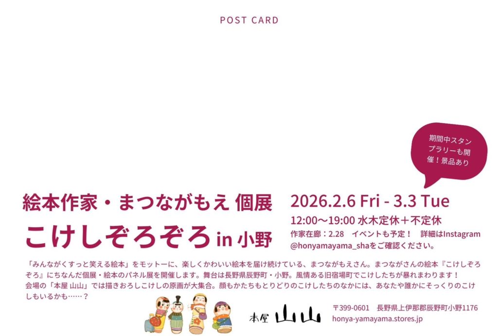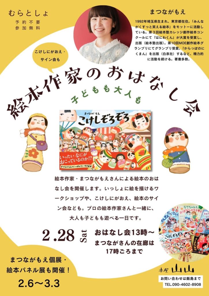 2月28日にはまつながさんが小野に来訪! 大人も子どもも楽しめる!まつながさんご自身による「おはなし会」を開催します。アコーディオンも弾けるまつながさん。歌あり笑いありの楽しい時間を絵本とともにお届けします。「おはなし会」の後は、絵本のサイン会に加えて、「こけしにがおえ会」もあります! みんなをかわいいこけしに変身させてくれちゃいます! その他空き時間には、一緒におえかきできる遊びタイムも。ぜひ28日はまつながさんと遊びに、親子でもひとりでも、おともだちとでもぶらりとむらとしょにお越しください!